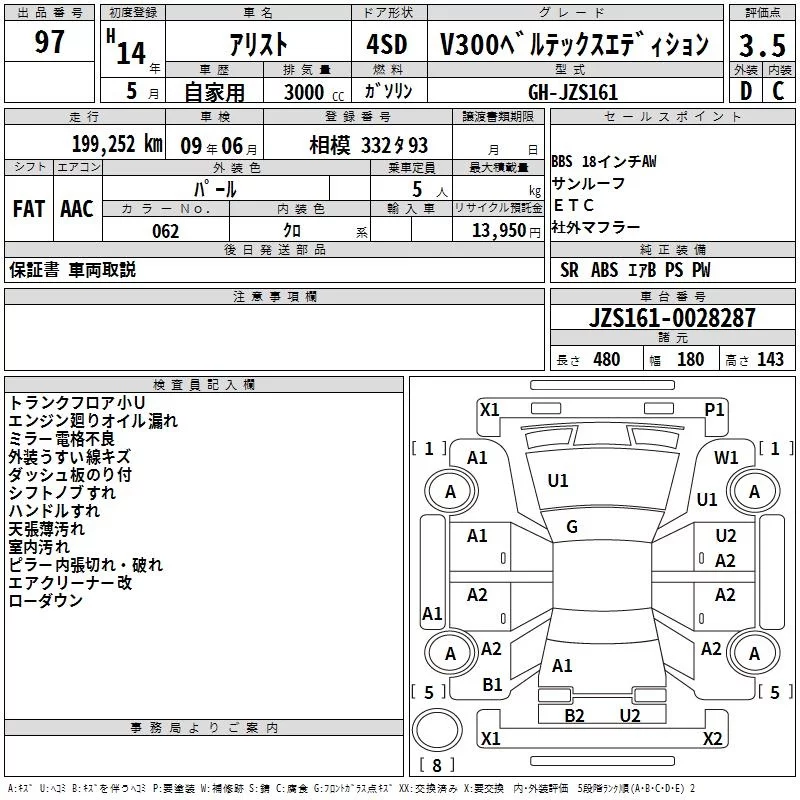 Toyota ARISTO с аукциона Японии TAA Yokohama лот № 97