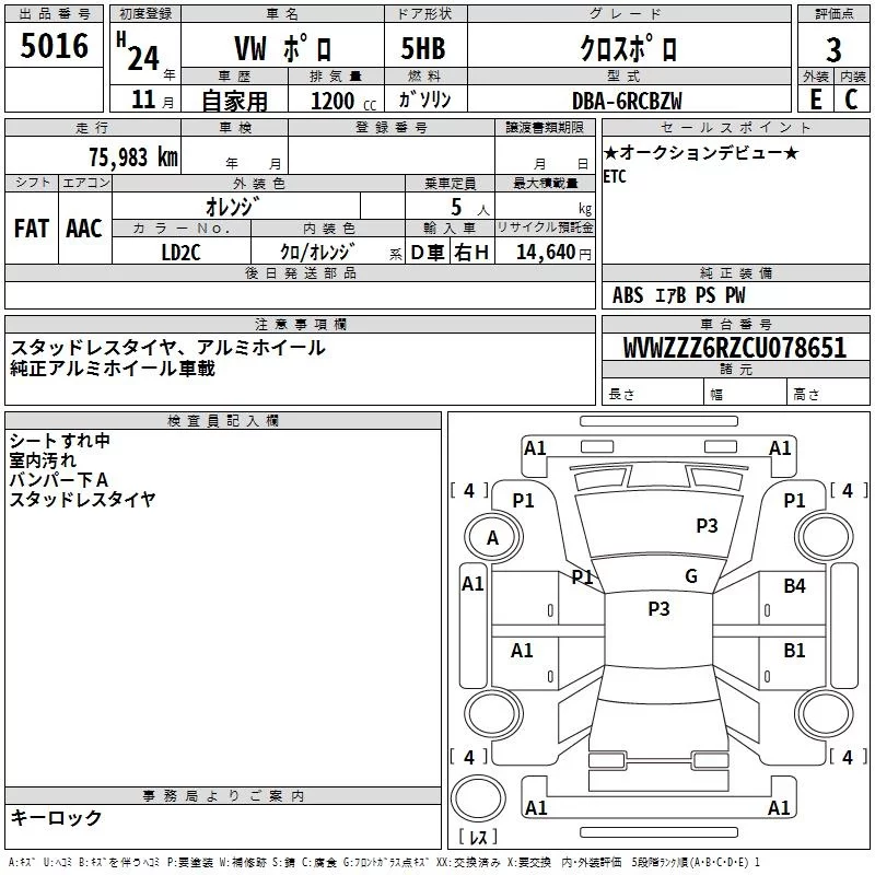Volkswagen CROSS POLO с аукциона Японии TAA Yokohama лот № 5016