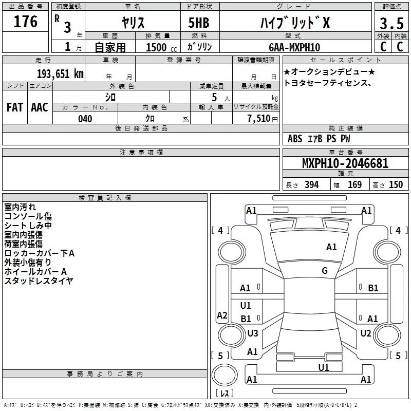 Toyota YARIS с аукциона Японии TAA Yokohama лот № 176