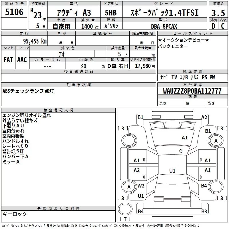 Audi A3 с аукциона Японии TAA Yokohama лот № 5106