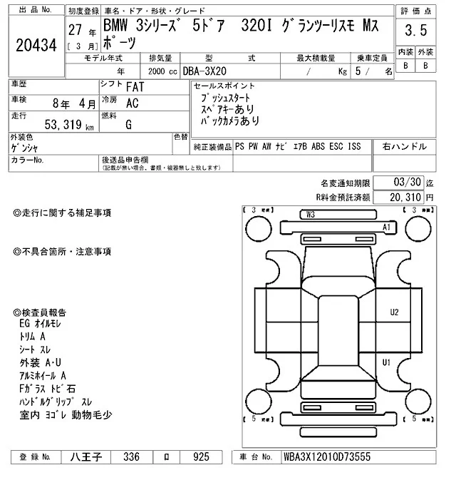 BMW 3-Series с аукциона Японии ARAI Oyama VT лот № 20434