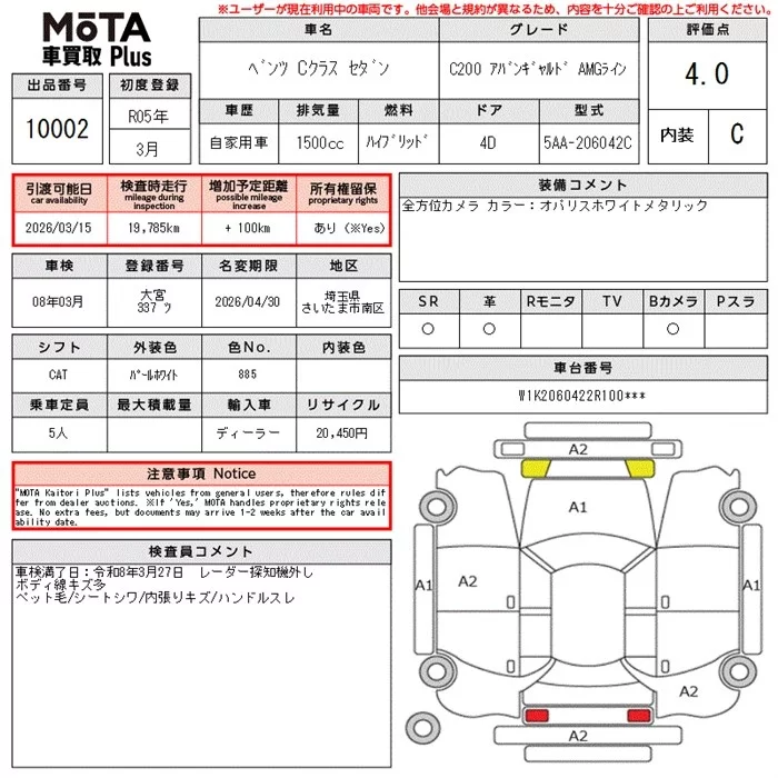 Mercedes-Benz C CLASS с аукциона Японии MOTA Kuruma Kaitori Plus лот № 10002