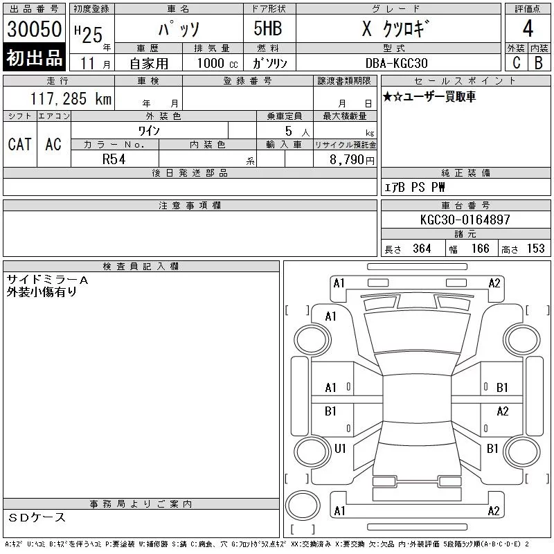 Toyota PASSO с аукциона Японии CAA Gifu лот № 30050