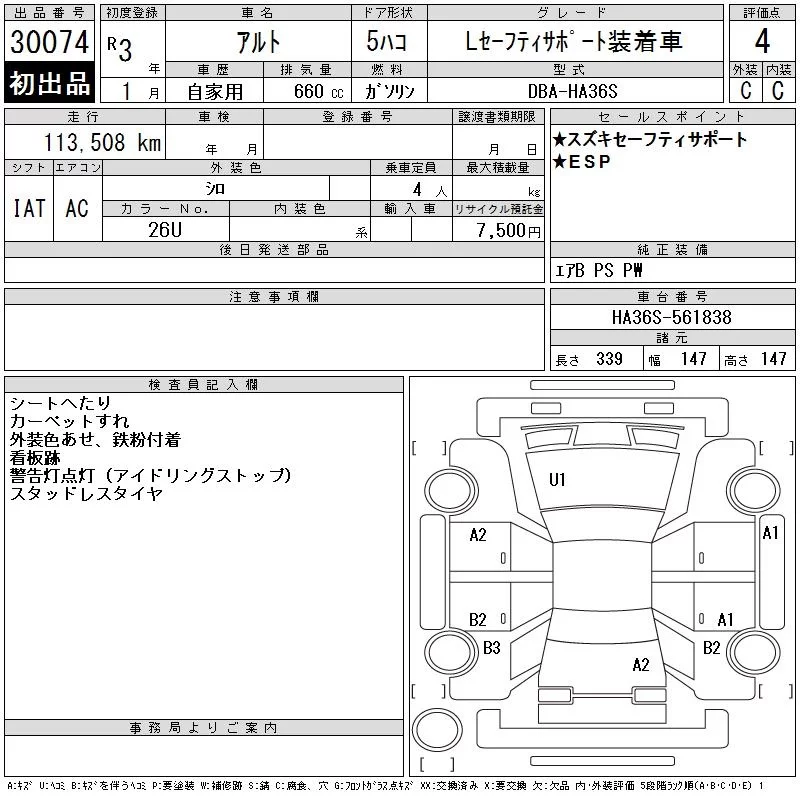 Suzuki ALTO с аукциона Японии CAA Gifu лот № 30074