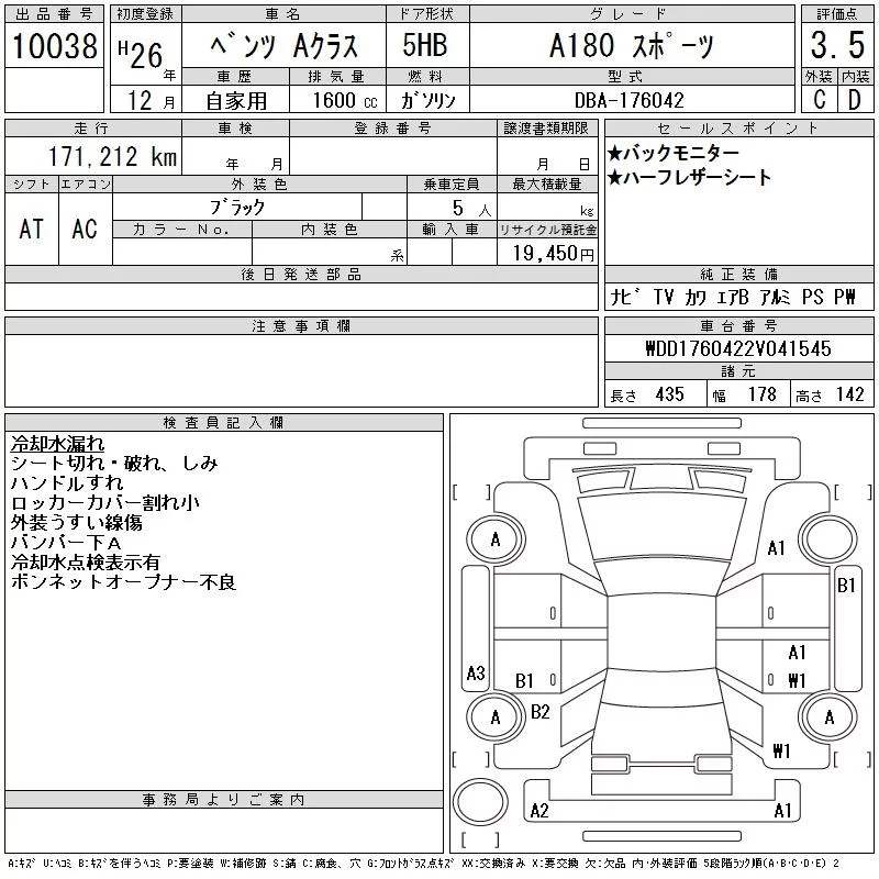 Mercedes-Benz A CLASS с аукциона Японии CAA Gifu лот № 10038