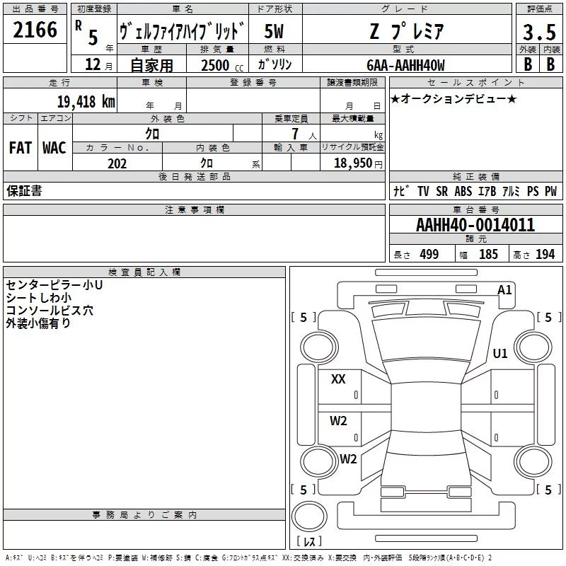 Toyota VELLFIRE с аукциона Японии TAA Kinki лот № 2166