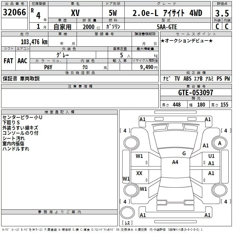 Subaru XV с аукциона Японии TAA Kinki лот № 32066