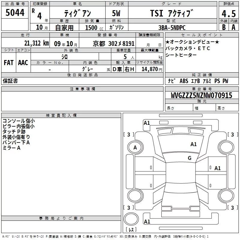 Volkswagen TIGUAN с аукциона Японии TAA Kinki лот № 5044