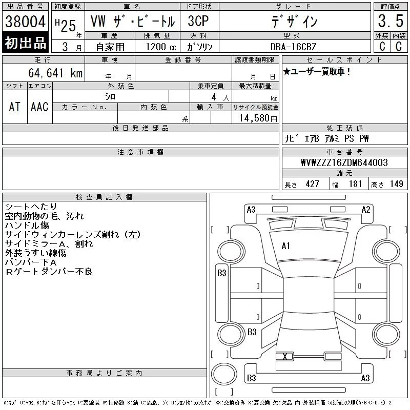 Volkswagen THE BEETLE с аукциона Японии CAA Tokyo лот № 38004