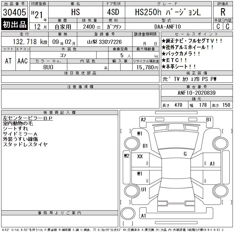 Lexus HS с аукциона Японии CAA Tokyo лот № 30405