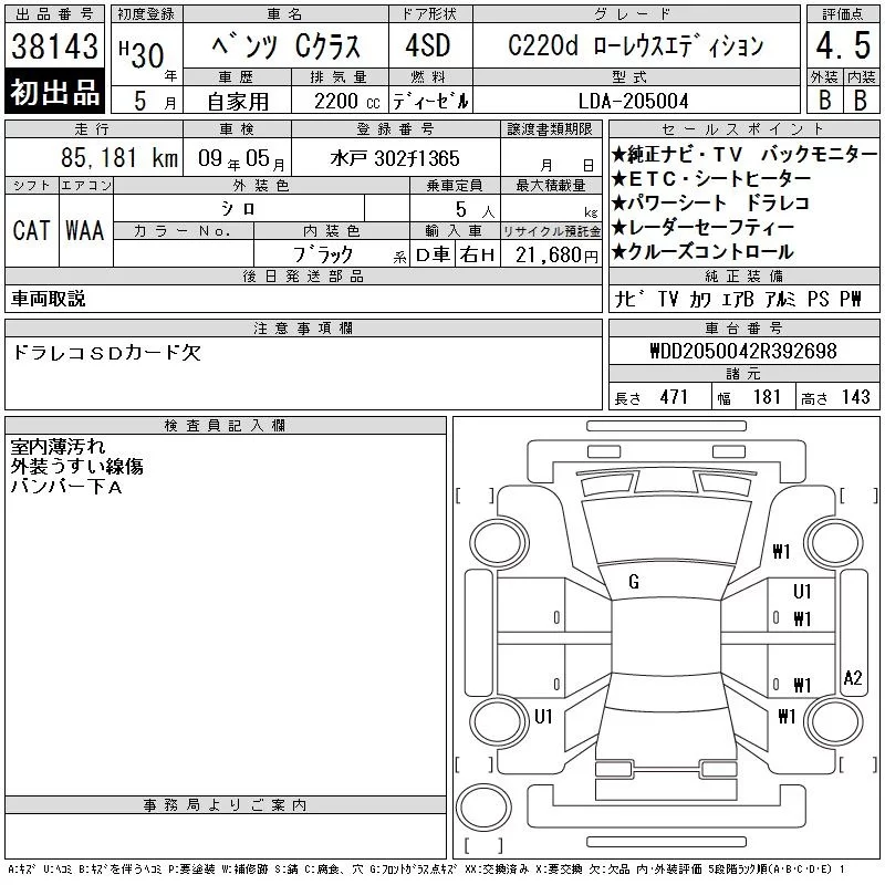 Mercedes-Benz C CLASS с аукциона Японии CAA Tokyo лот № 38143