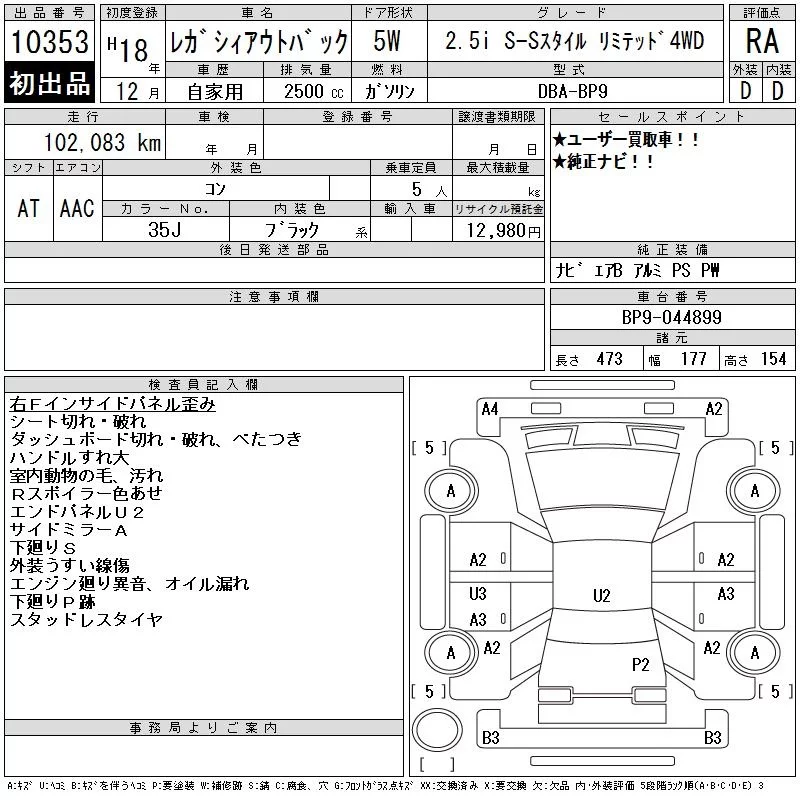 Subaru LEGACY OUTBACK с аукциона Японии CAA Tokyo лот № 10353