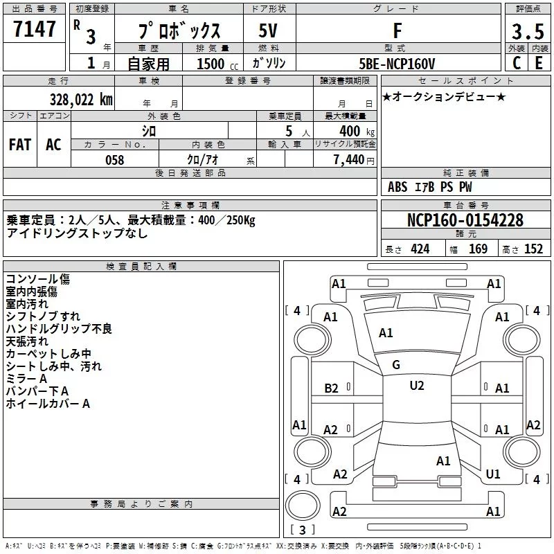 Toyota PROBOX с аукциона Японии TAA Hiroshima лот № 7147