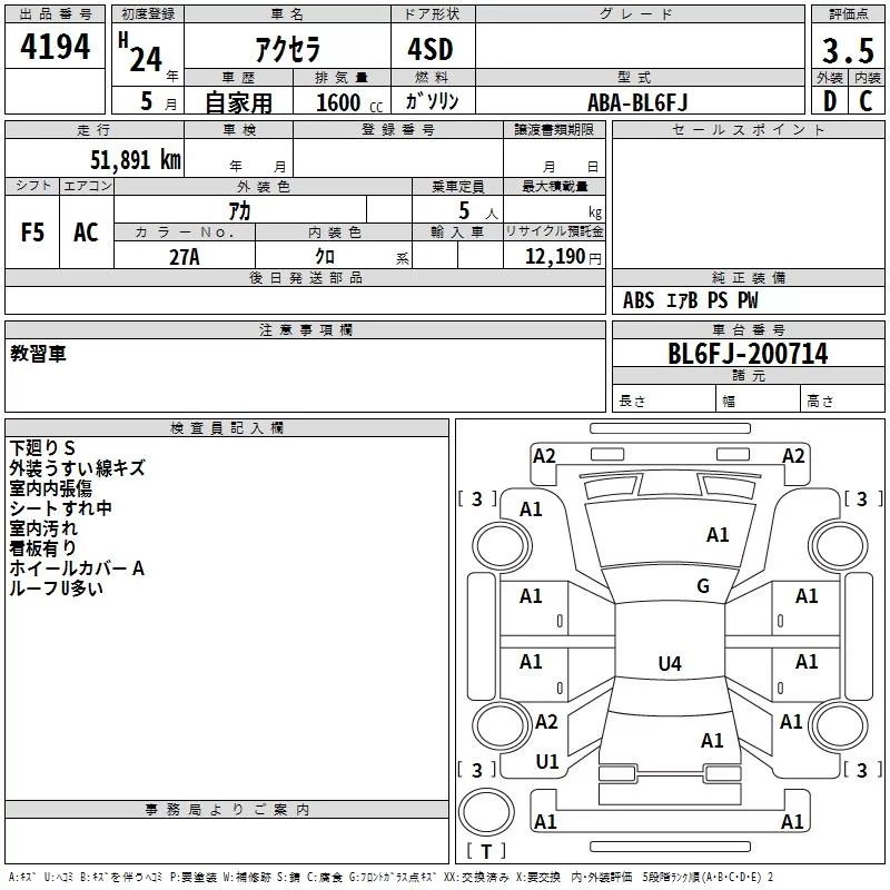 Mazda AXELA с аукциона Японии TAA Kyushu лот № 4194