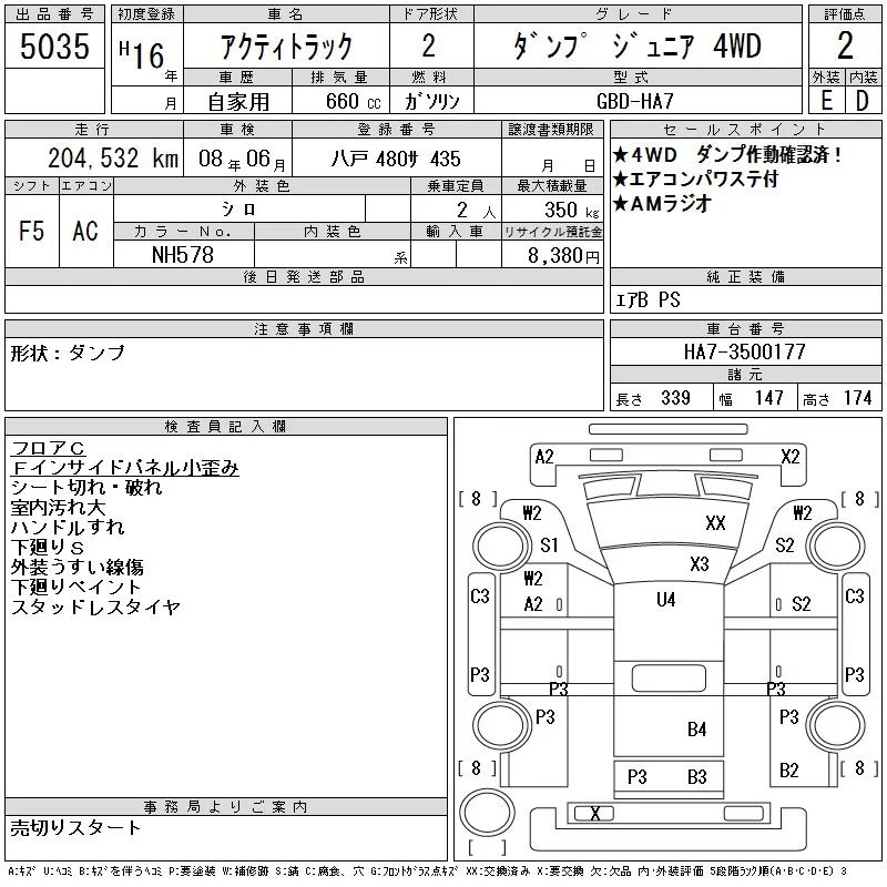 Honda ACTY TRUCK с аукциона Японии CAA Tohoku лот № 5035