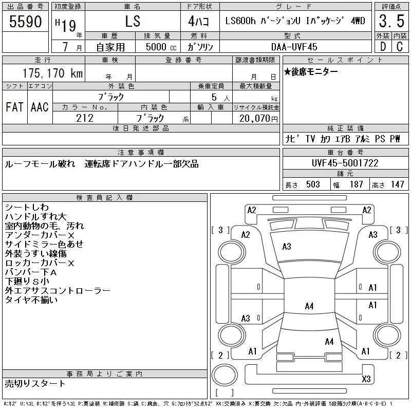 Lexus LS с аукциона Японии CAA Tohoku лот № 5590