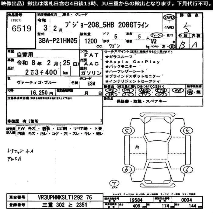Peugeot 208 с аукциона Японии JU Mie лот № 6519