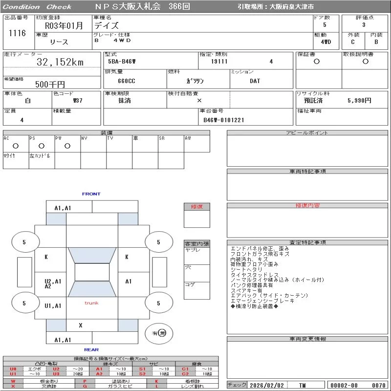 Nissan DAYZ с аукциона Японии NPS Osaka Nyusatsu лот № 1116