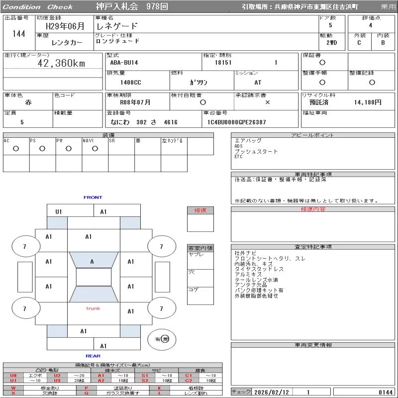Chrysler JEEP RENEGADE с аукциона Японии ORIX Kobe Nyusatsu лот № 144