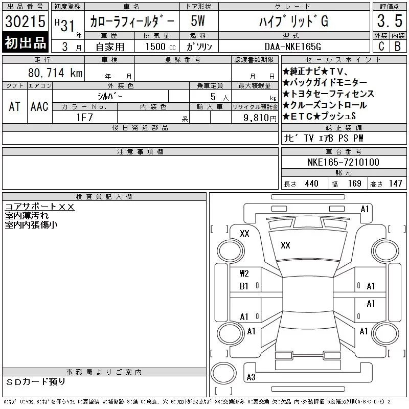 Toyota COROLLA FIELDER с аукциона Японии CAA Chubu лот № 30215
