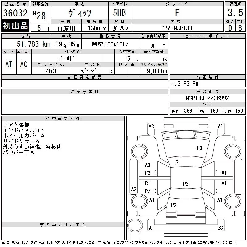 Toyota VITZ с аукциона Японии CAA Chubu лот № 36032