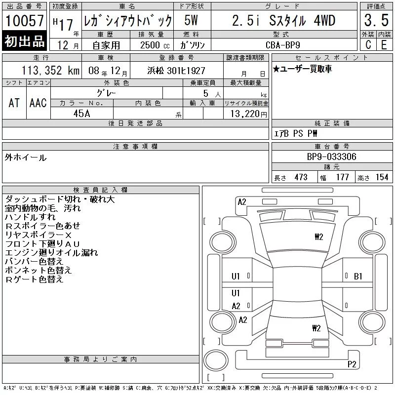 Subaru LEGACY OUTBACK с аукциона Японии CAA Chubu лот № 10057