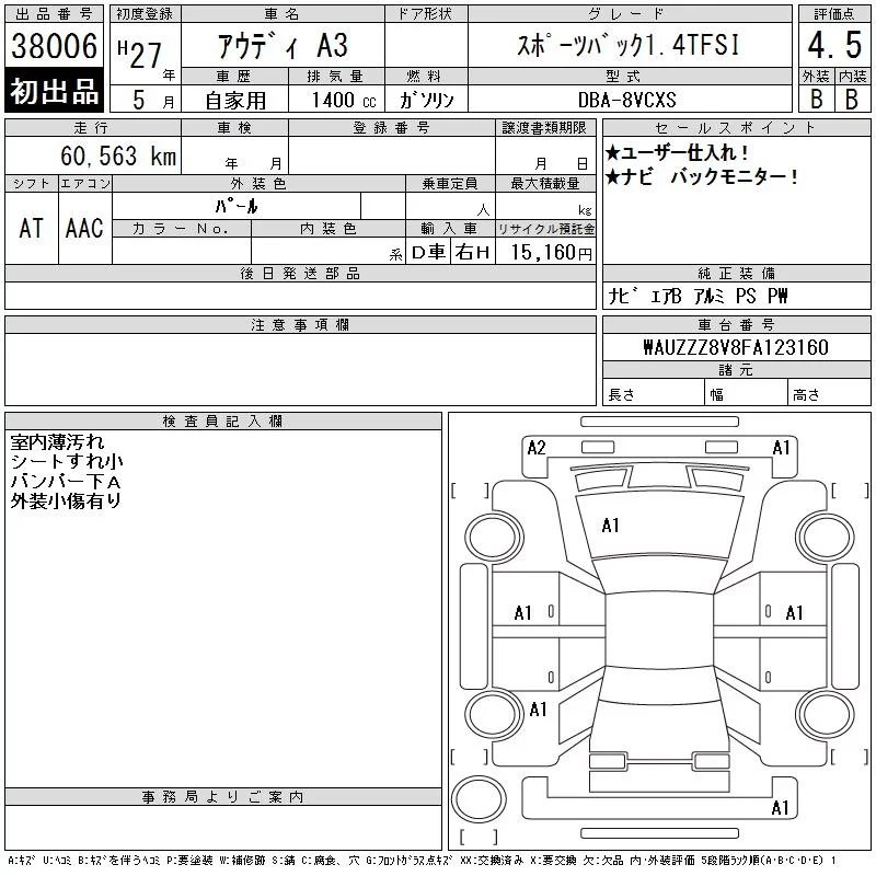 Audi A3 с аукциона Японии CAA Chubu лот № 38006