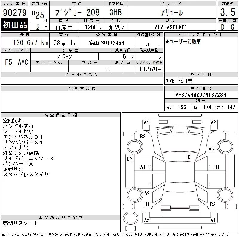 Peugeot 208 с аукциона Японии CAA Chubu лот № 90279