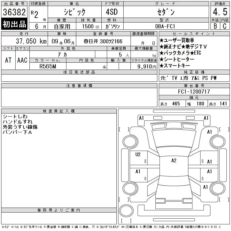 Honda CIVIC с аукциона Японии CAA Chubu лот № 36382