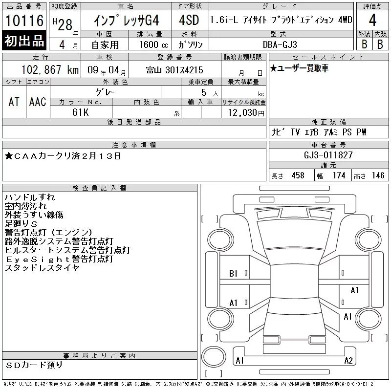 Subaru IMPREZA G4 с аукциона Японии CAA Chubu лот № 10116