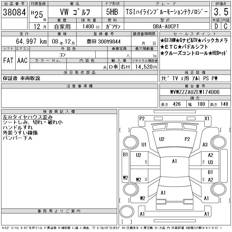 Volkswagen GOLF с аукциона Японии CAA Chubu лот № 38084