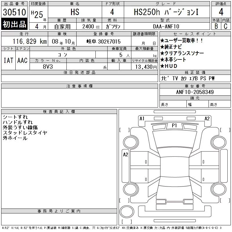 Lexus HS с аукциона Японии CAA Chubu лот № 30510