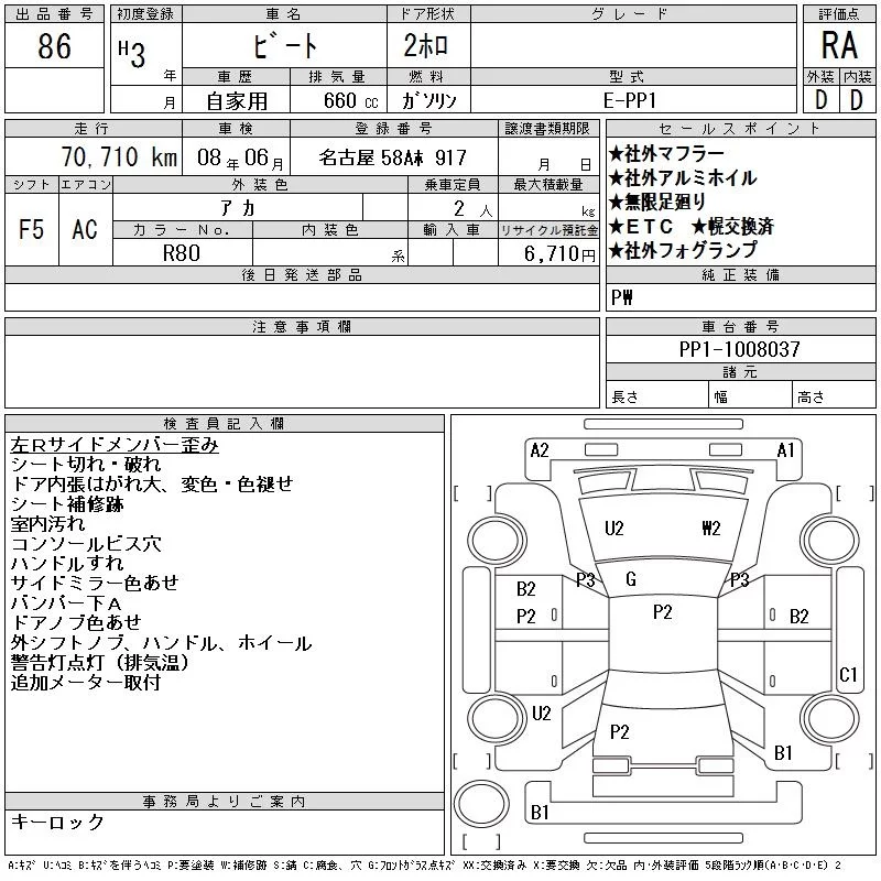 Honda BEAT с аукциона Японии CAA Chubu лот № 86