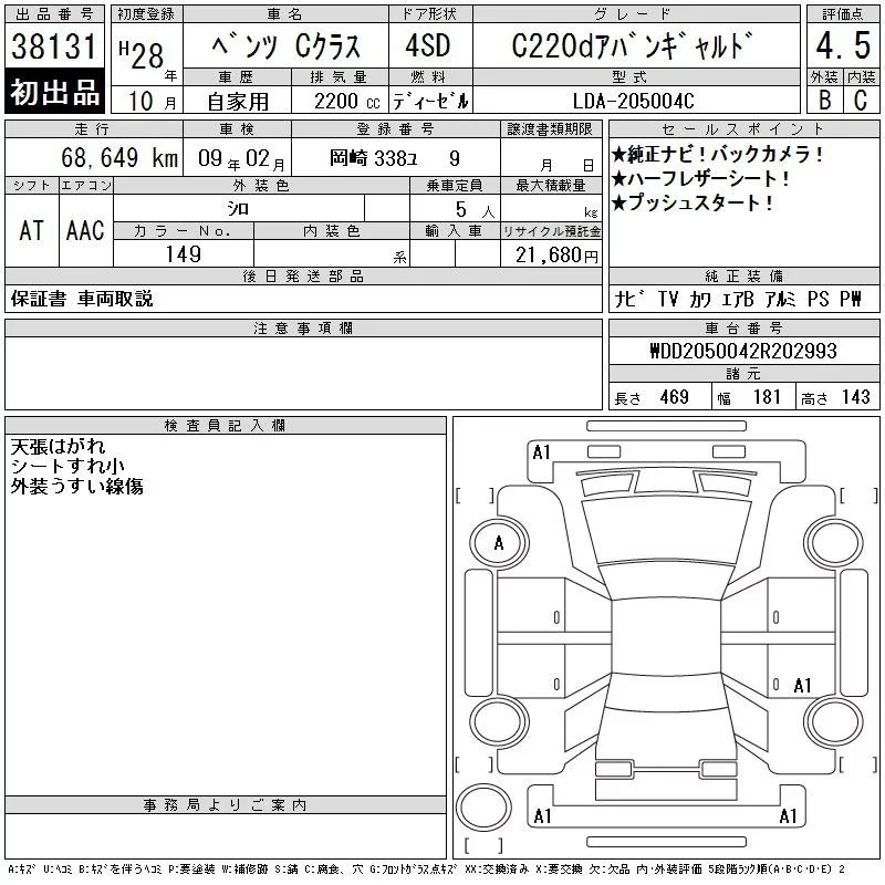 Mercedes-Benz C CLASS с аукциона Японии CAA Chubu лот № 38131