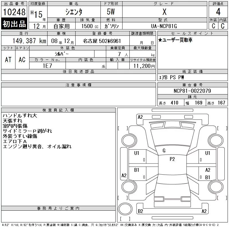 Toyota SIENTA с аукциона Японии CAA Chubu лот № 10248