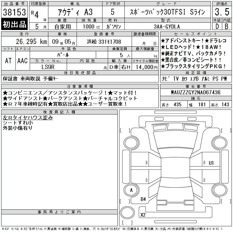 Audi A3 с аукциона Японии CAA Chubu лот № 38153
