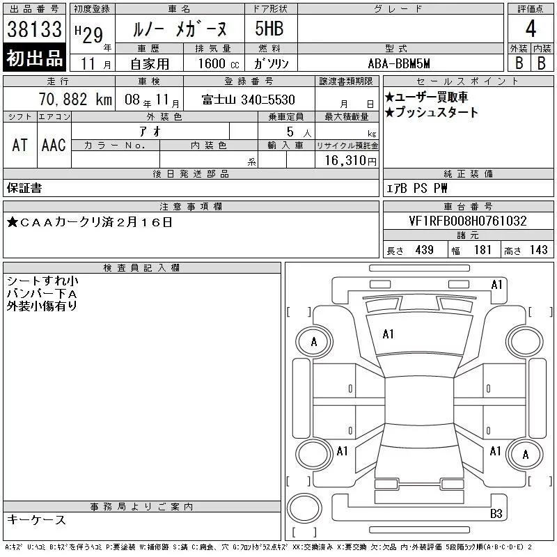 Renault MEGANE с аукциона Японии CAA Chubu лот № 38133