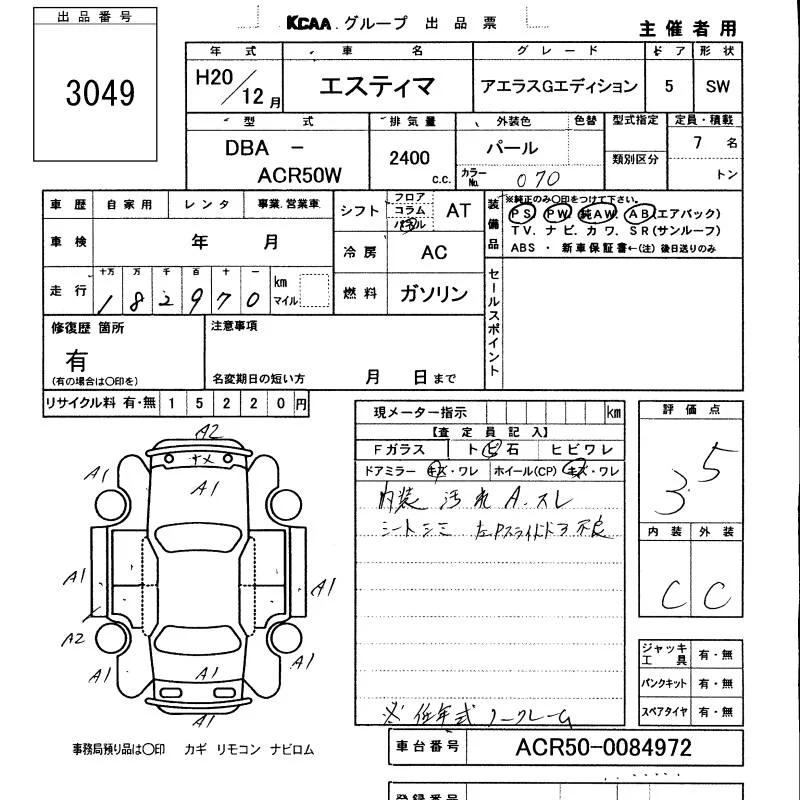 Toyota ESTIMA с аукциона Японии KCAA Minami Kyushu лот № 3049