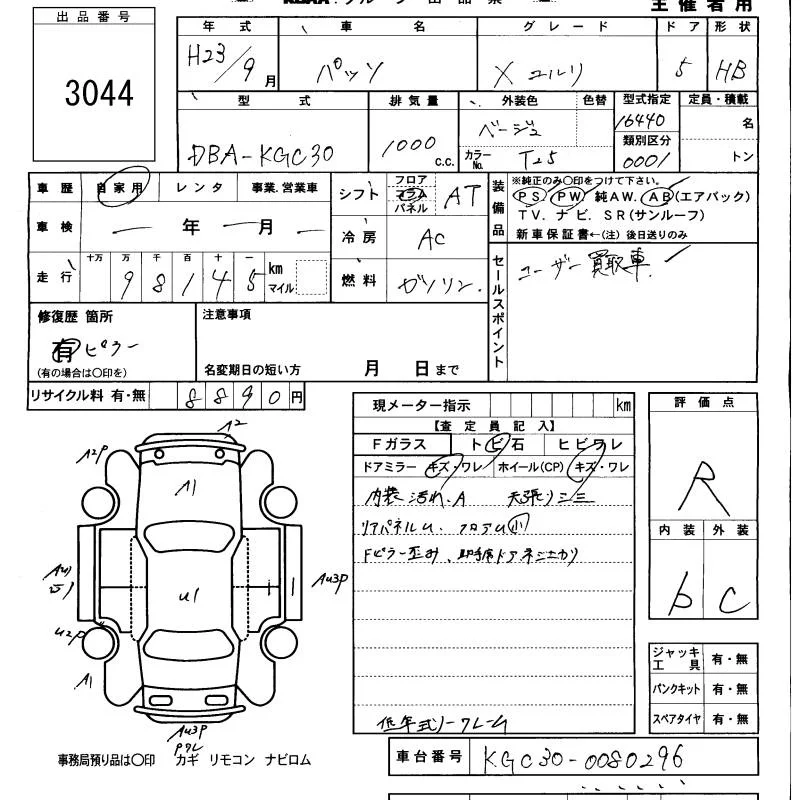 Toyota PASSO с аукциона Японии KCAA Minami Kyushu лот № 3044
