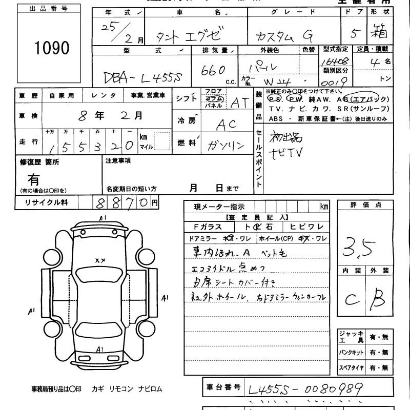 Daihatsu TANTO EXE с аукциона Японии KCAA Minami Kyushu лот № 1090