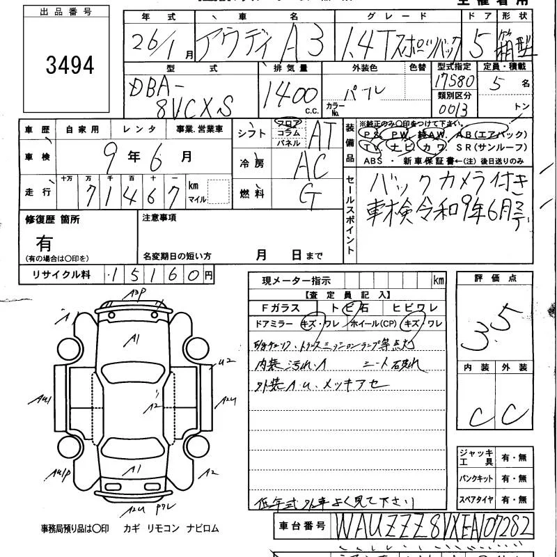 Audi A3 с аукциона Японии KCAA Minami Kyushu лот № 3494