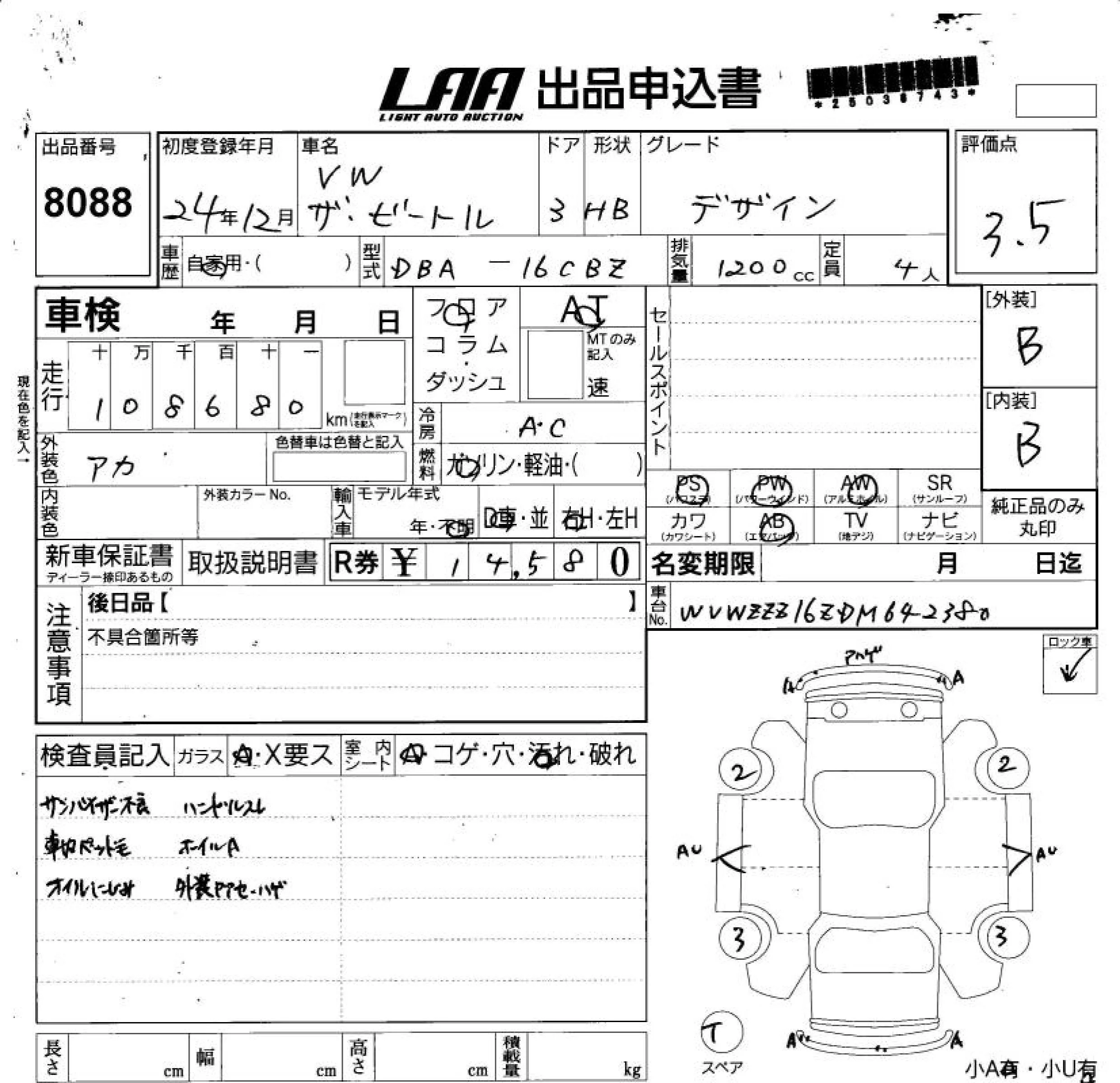 Volkswagen THE BEETLE с аукциона Японии LAA Shikoku лот № 8088
