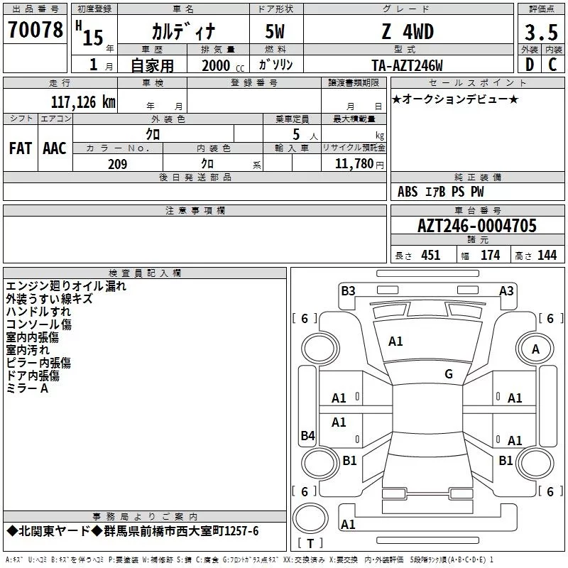 Toyota CALDINA с аукциона Японии TAA Kanto лот № 70078