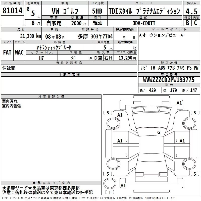 Volkswagen GOLF с аукциона Японии TAA Kanto лот № 81014