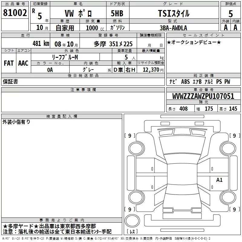 Volkswagen POLO с аукциона Японии TAA Kanto лот № 81002