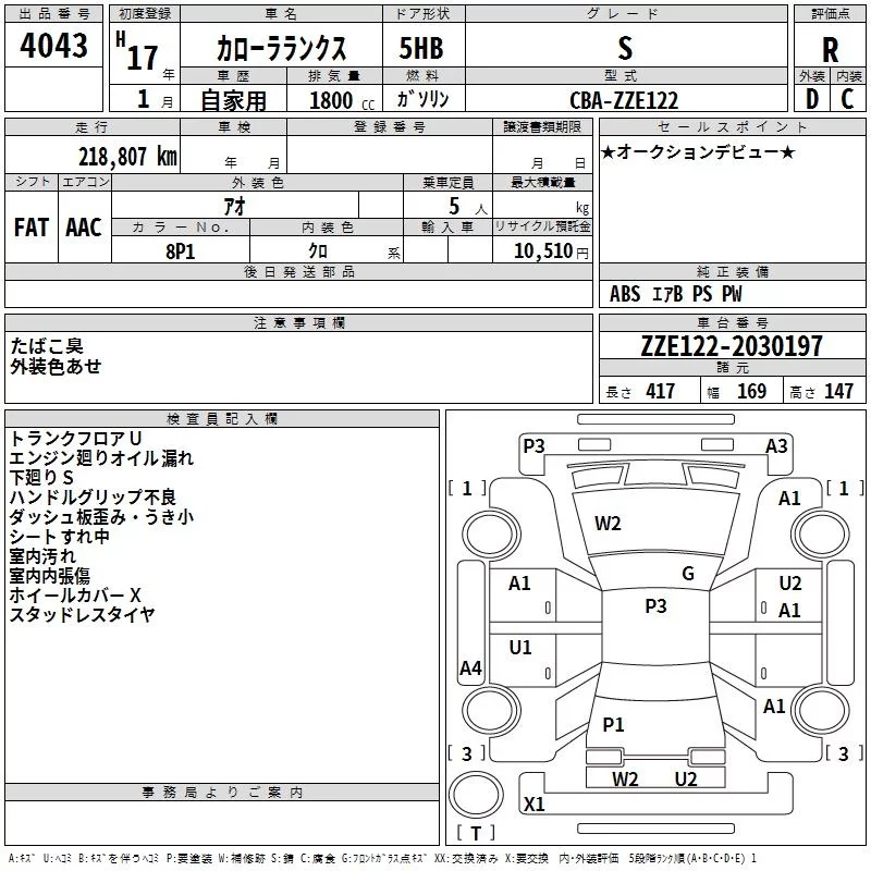 Toyota COROLLA RUNX с аукциона Японии TAA Chubu лот № 4043