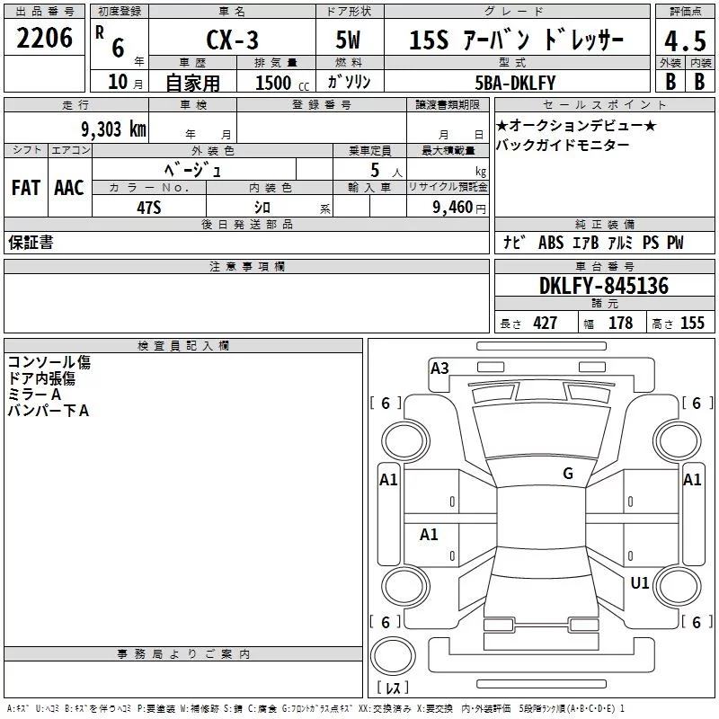 Mazda CX-3 с аукциона Японии TAA Chubu лот № 2206