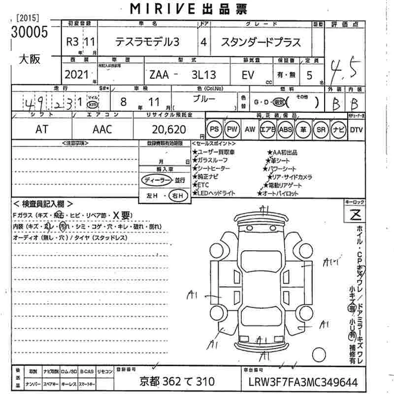 Tesla MODEL3 с аукциона Японии MIRIVE Osaka лот № 30005