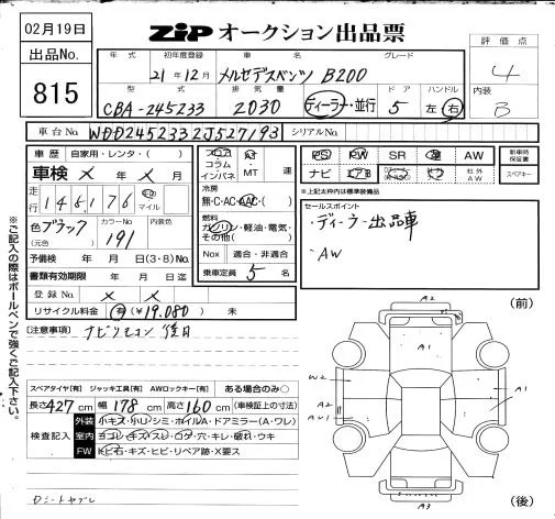 Mercedes-Benz B CLASS с аукциона Японии ZIP Osaka лот № 815