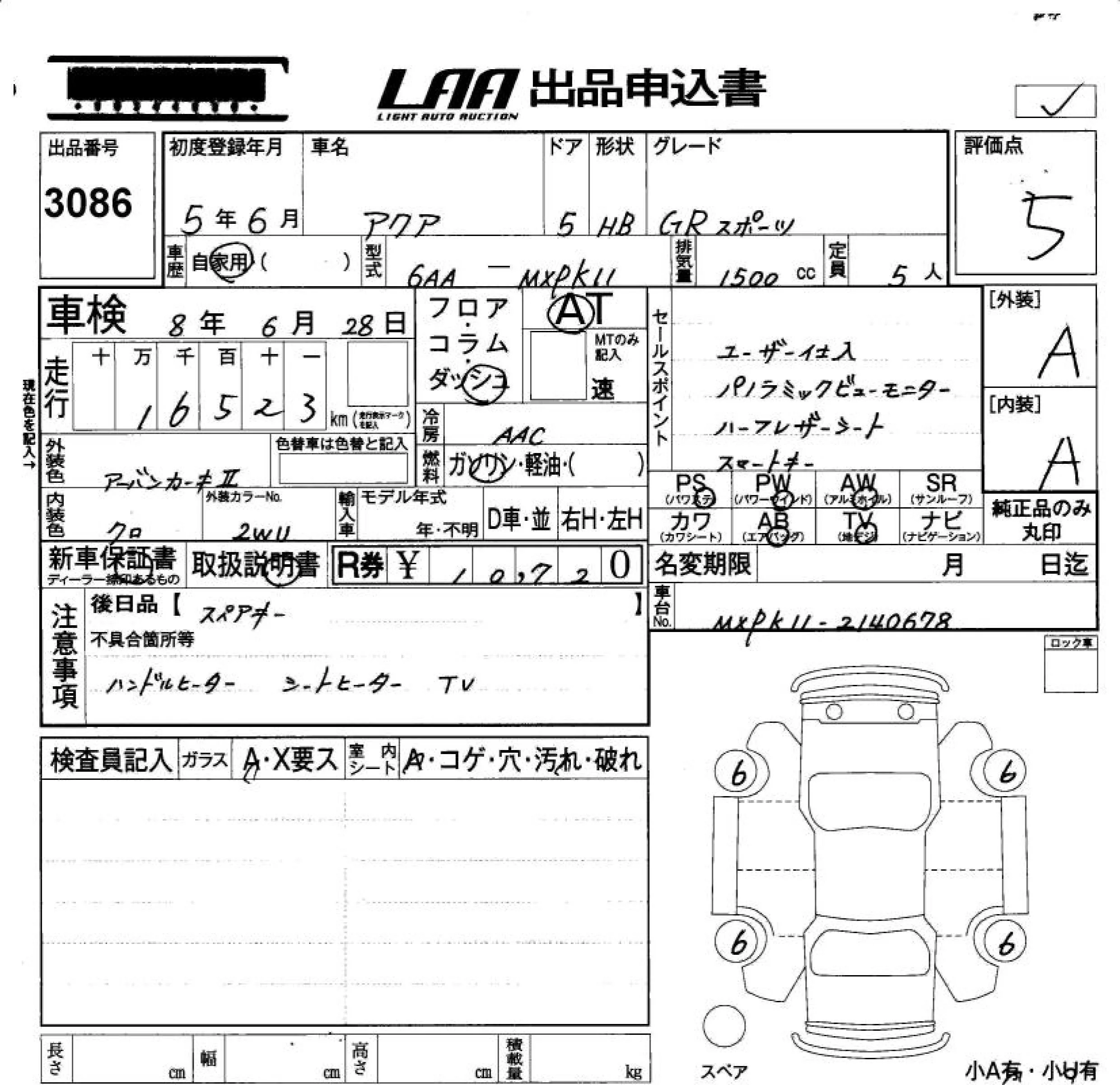 Toyota AQUA с аукциона Японии LAA Okayama лот № 3086